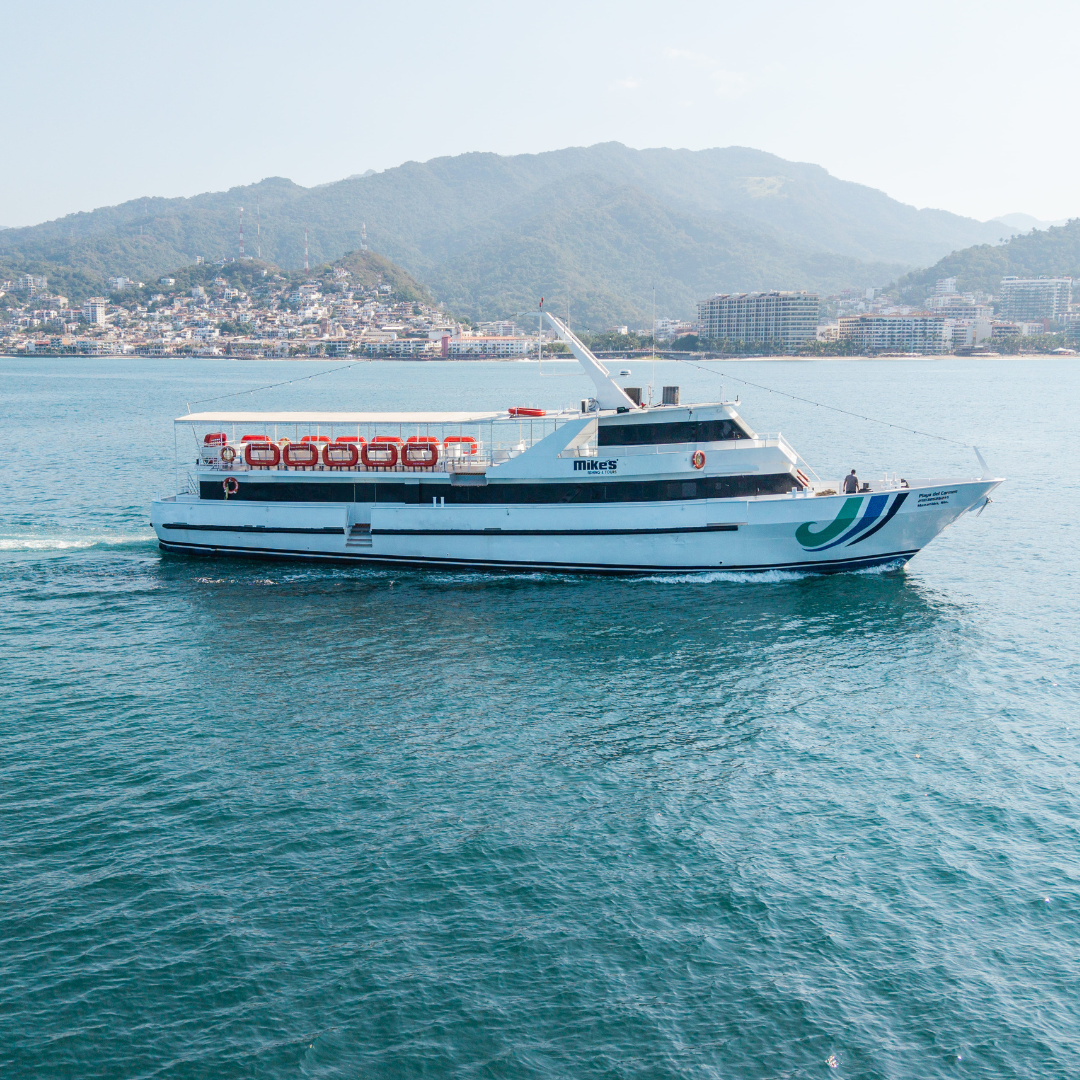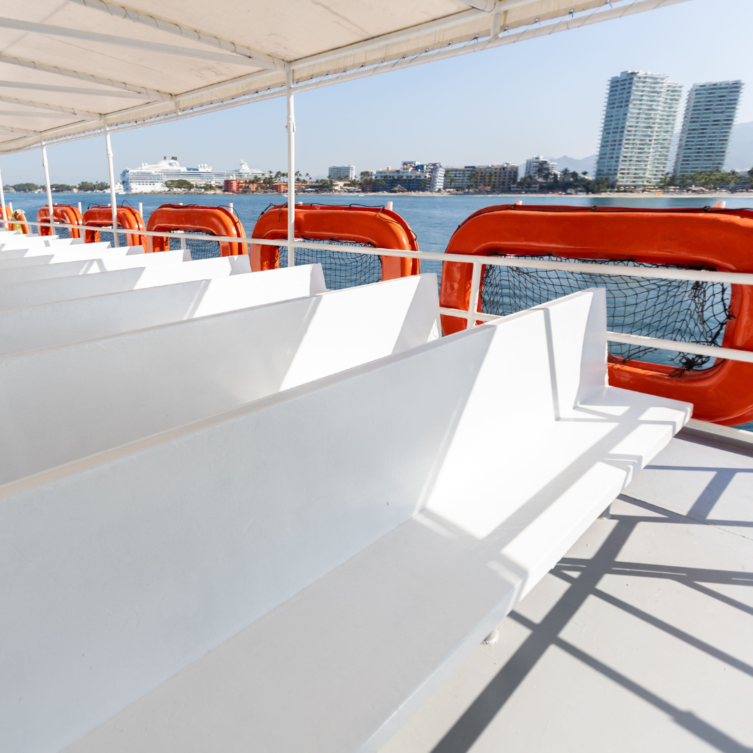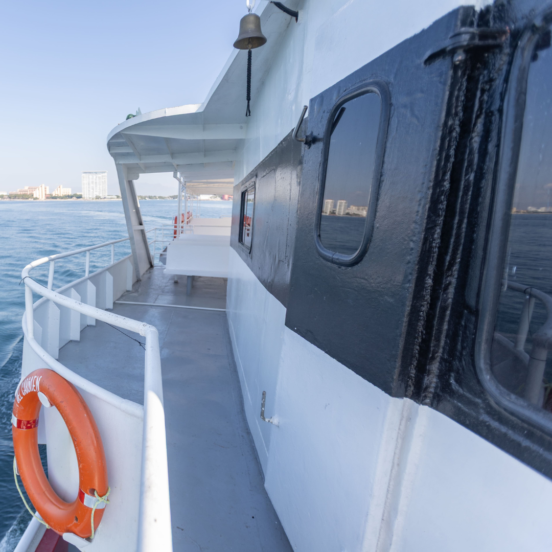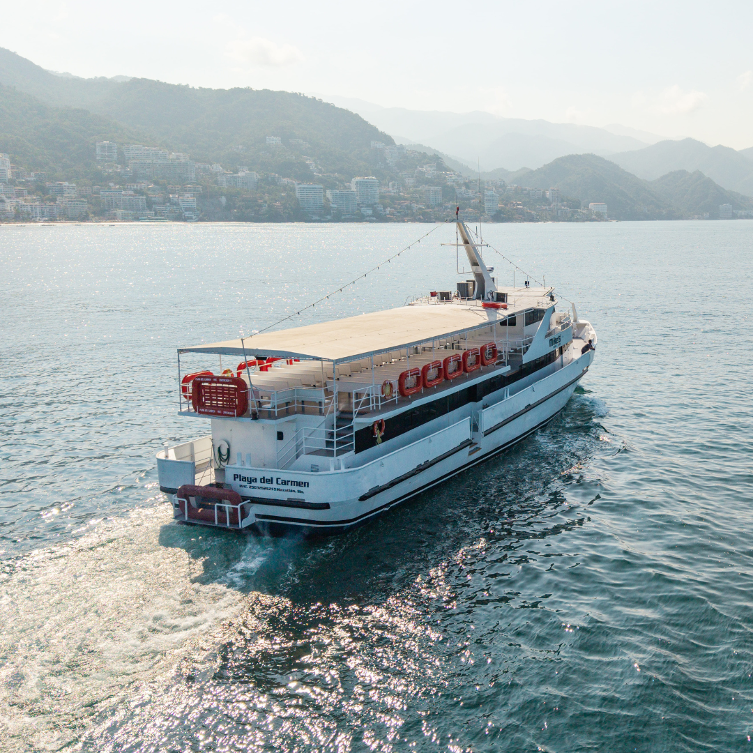 Embárquese en una experiencia única a bordo del “Playa del Carmen”, una embarcación espaciosa diseñada para su máxima comodidad. Relájese en nuestra área interior con aire acondicionado, con capacidad para 250 personas, o disfrute de la brisa marina desde la cubierta abierta mientras navegamos por la impresionante Bahía de Banderas.